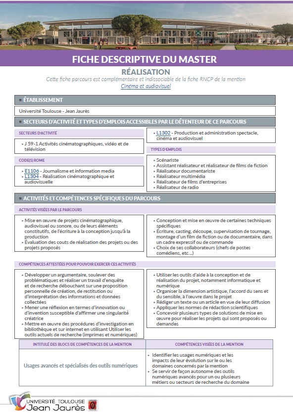 Le master "Réalisation" est une formation « généralistes de l’expression audiovisuelle" où il s'agit de mettre l’accent sur les deux points suivants :
